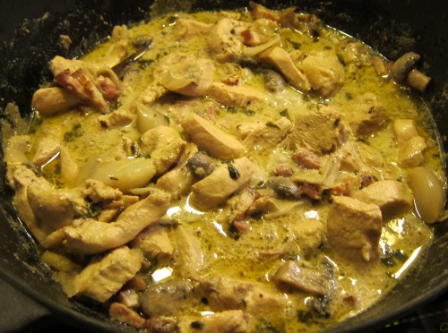 Smelt smørret i en gryde, når det er bruset af, kommer man kyllingestykker, løg, hvidløg, bacon og | Smelt smørret i en gryde, når det er bruset af, kommer man kyllingestykker, løg, hvidløg, bacon, persille, timian og laurbær i gryden .<br> | ||
