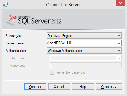 Open SQL Server Management Studio and enter '''(LocalDB)\v11.0''' as Server name in the Connect to Server dialog.<br> | |||